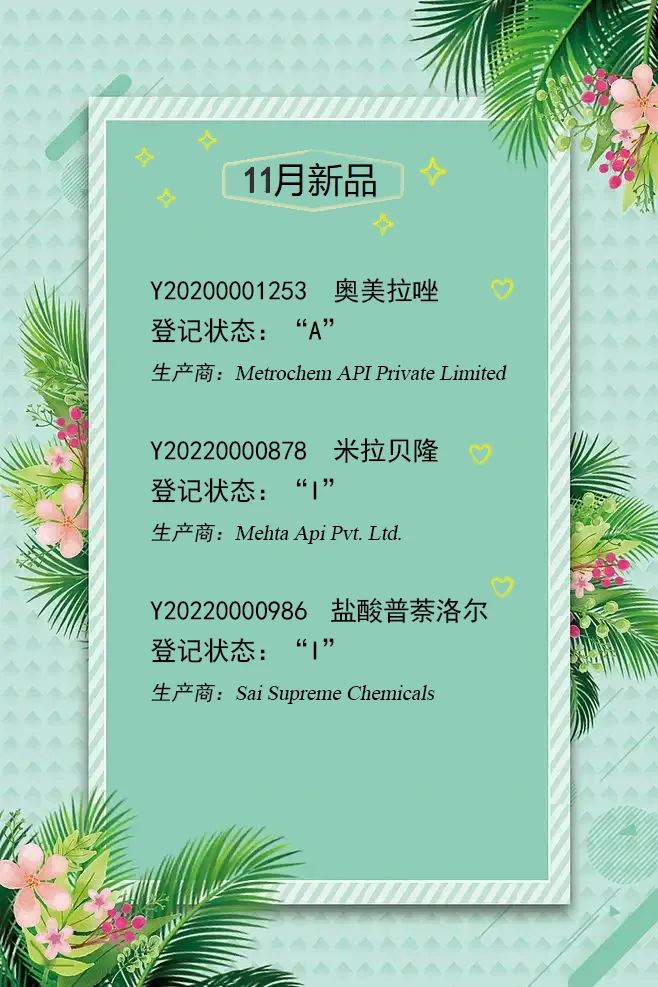 我司积极进行原料药审批,几乎每月均有新增批准品种。